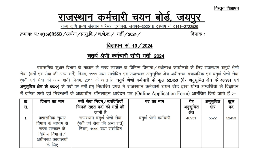 राजस्थान कर्मचारी चयन बोर्ड द्वारा प्रशासनिक सुधार विभाग के माध्यम से चतुर्थ श्रेणी सीधी भर्ती का आयोजन किया जा रहा है